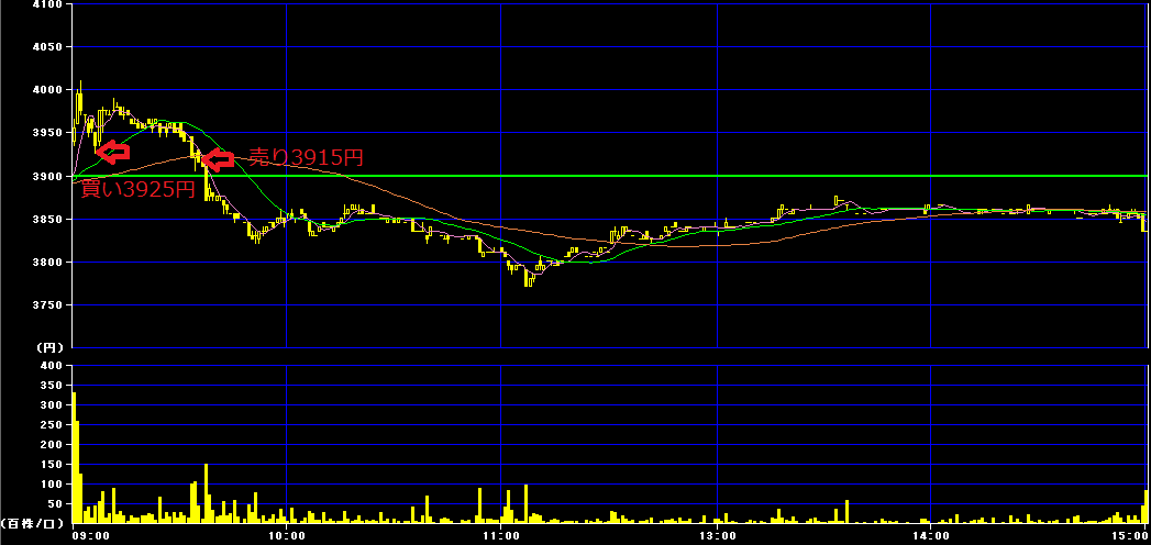 前場9時6分に3925円で200株購入。9時36分に3915円で損切り。