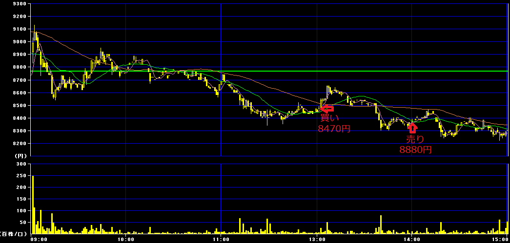 13時1分に8470円で100株購入。14時00分に8830円で損切り。