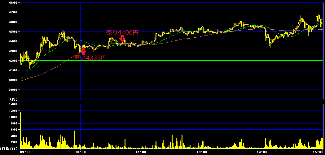 10時2分に4335円で100株買いインし、10時43分に4400円で利確。