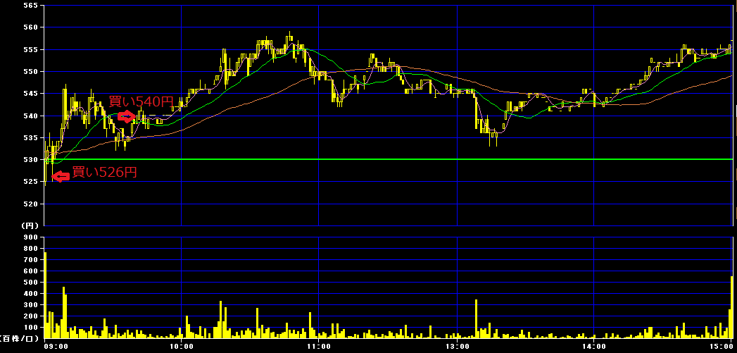 前場9時3分に526円で500株買いインし、9時40分に540円で利確。