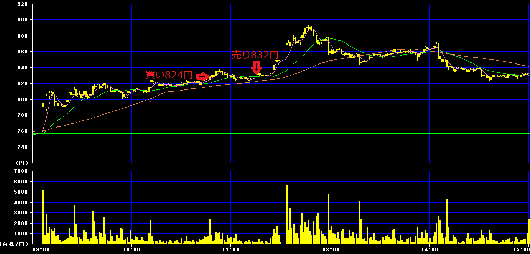 10時46分に824円で500株買いインし、11時17分に832円で利確。