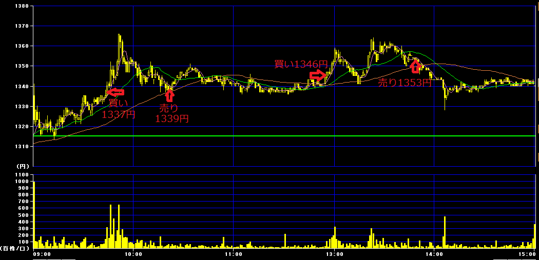 また後場12時56分に1346円で200株買いインし、13時49分に1353円で利確。