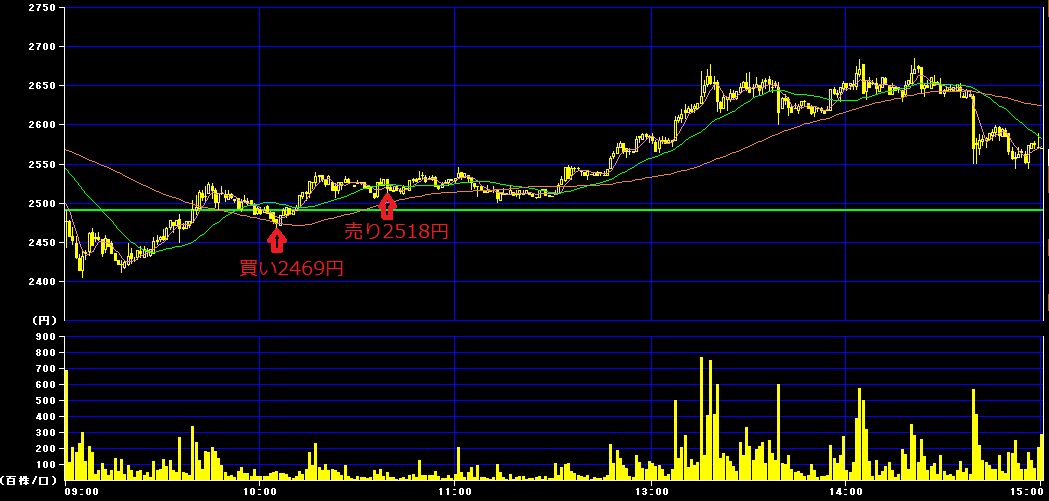 10時5分に2469円で200株買いインし、10時39分に2518円で利確。