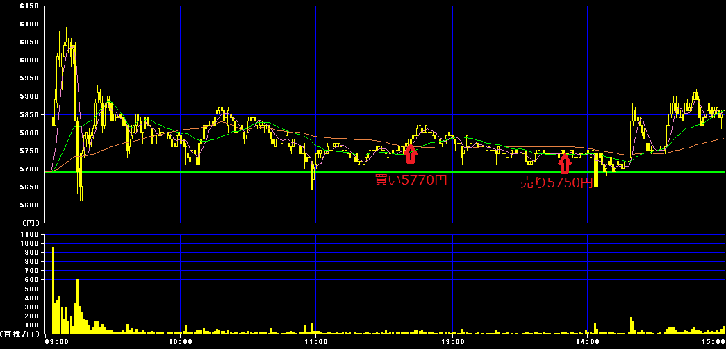 後場12時40分に5770円で100株買いインし、13時49分に5750円で損切り。