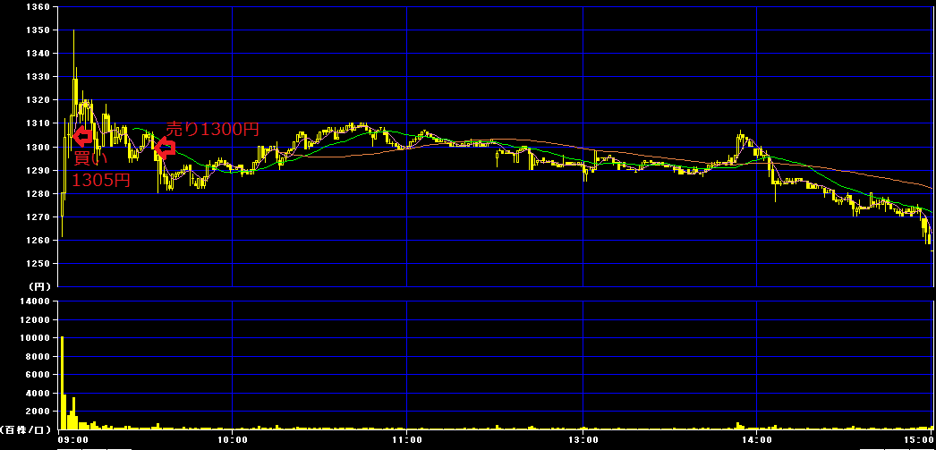 前場9時5分に1305円で300株買いインし、9時33分に1300円で損切り。