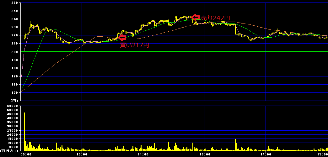 10時35分に217円で1000株買いインし、後場12時46分に242円で利確。