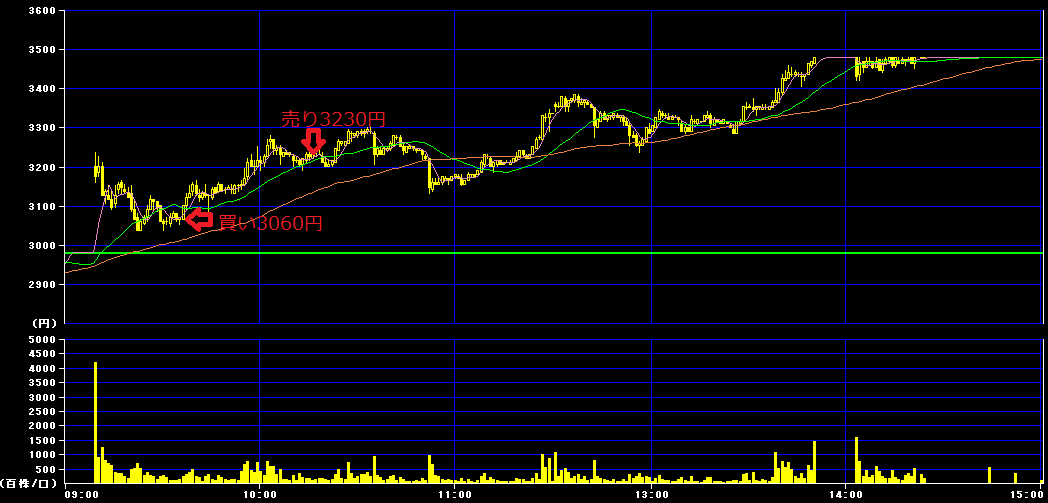 9時35分に3060円で200株買いインし、10時17分に3230円で利確。