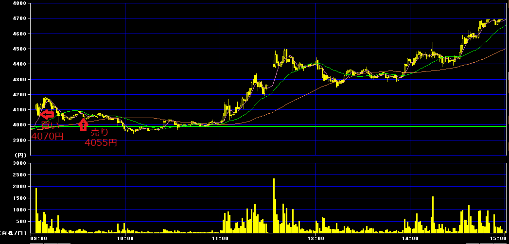 前場9時5分に4070円で100株買いインし、9時33分に4055円で損切り。