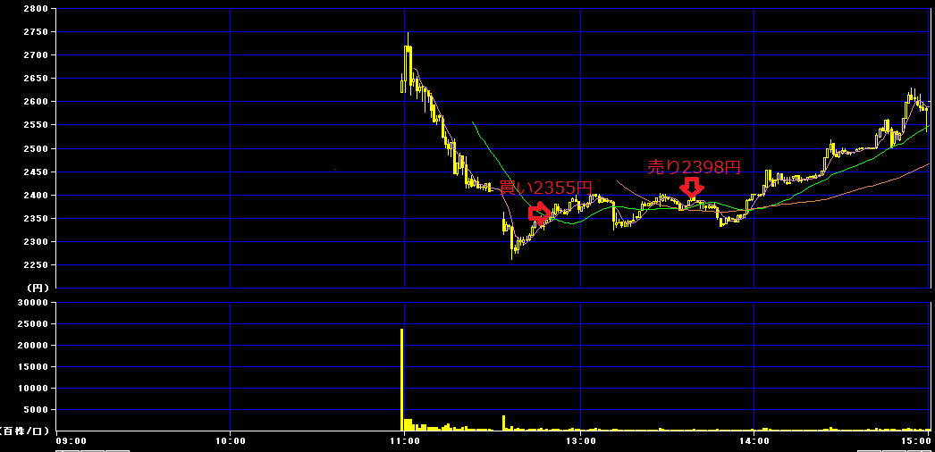後場12時50分に2355円で200株買いインし、13時39分に2398円で利確。