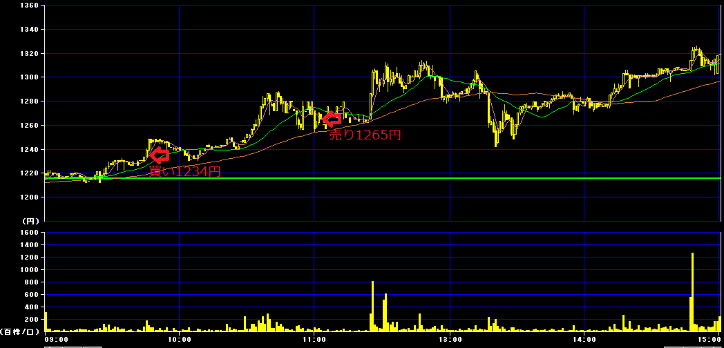 9時45分に1234円で200株買いインし、11時3分に1265円で利確。