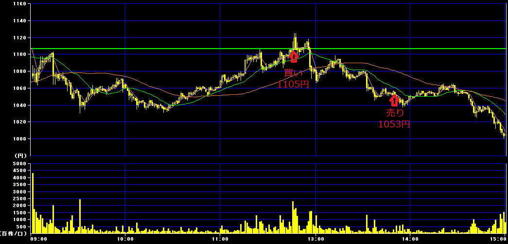 11時5分に1105円で300株買いインし、後場13時48分に1053円で損切り。