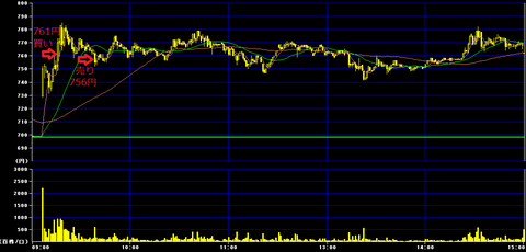 前場9時15分に761円で400株買いインし、9時38分に756円で損切り。