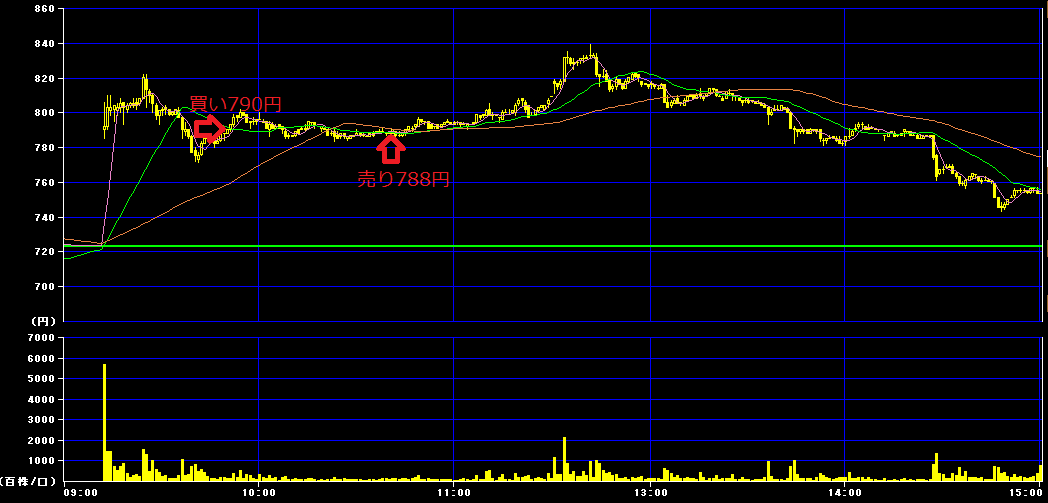 9時51分に790円で300株買いインし、10時40分に788円で損切り。