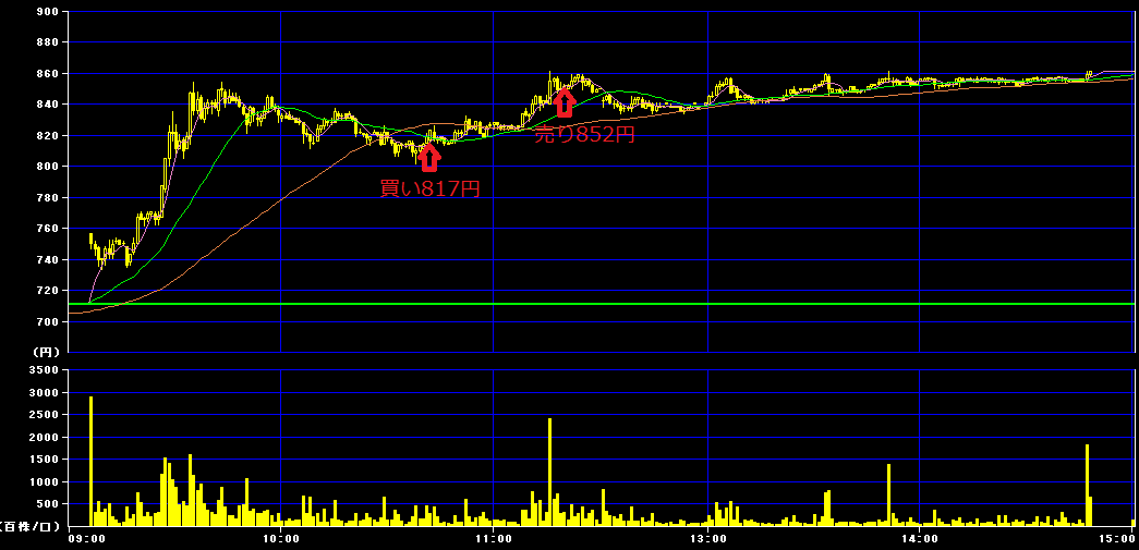 10時42分に817円で500株買いインし、11時20分に852円で利確。