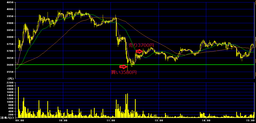 11時21分に3580円で200株買いインし、12時40分に3700円で利確。