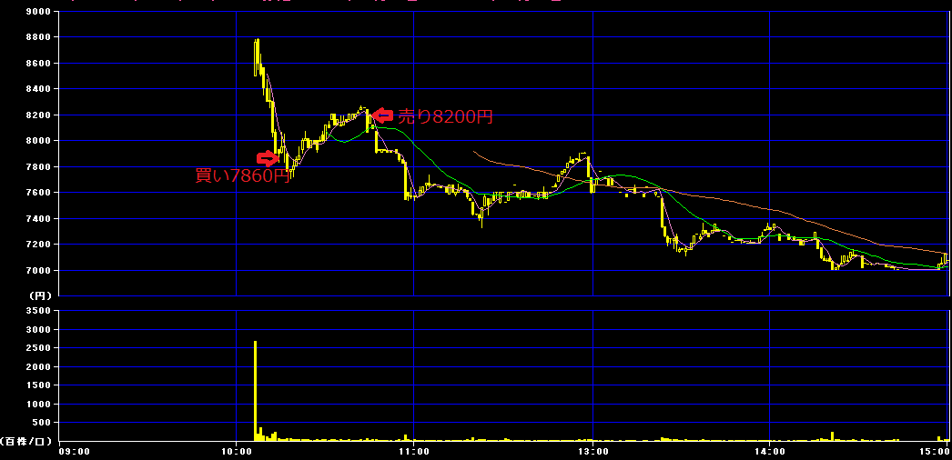 10時14分に7860円で100株買いインし、10時45分に8200円で利確。お見事。
