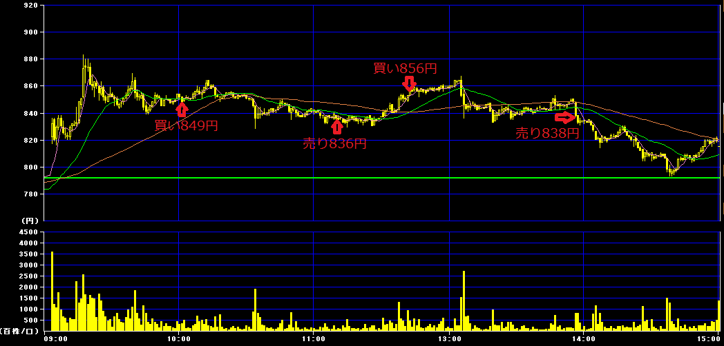 また後場12時42分に856円で400株買いインし、13時56分に838円で損切り。