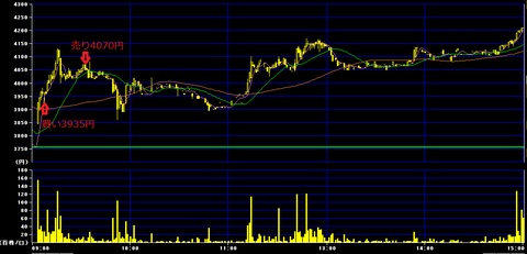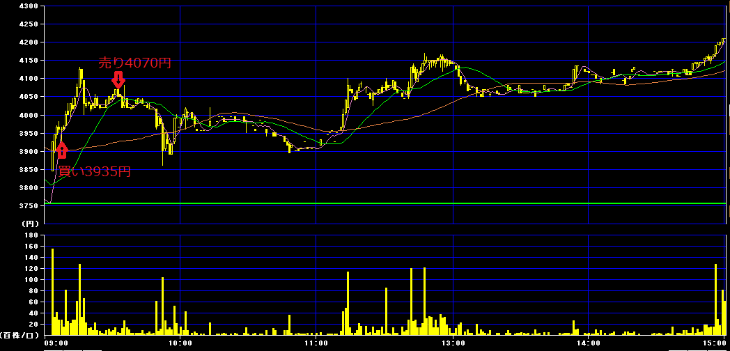 前場9時7分に3935円で100株買いインし、9時35分に4070円で利確。