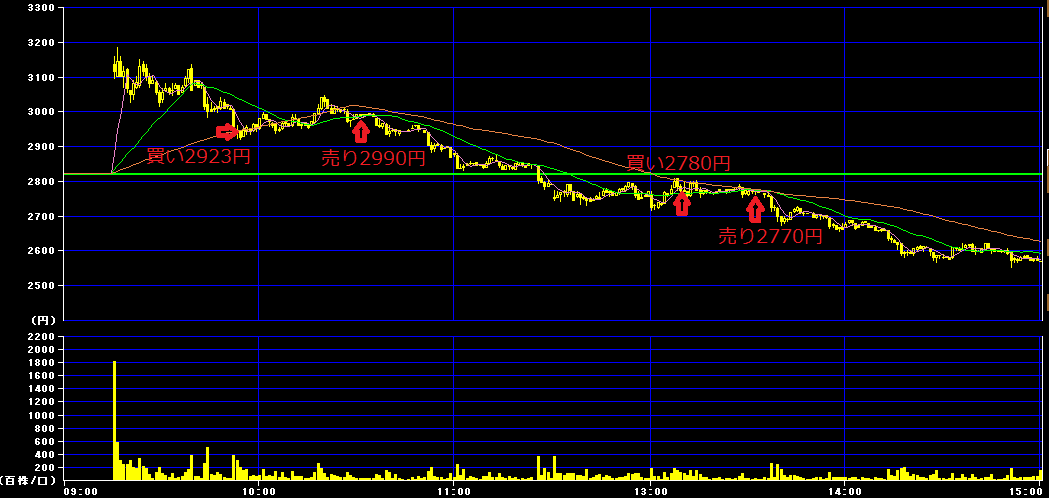 また後場13時8分に2780円で200株買いインし、13時30分に2770円で損切り。