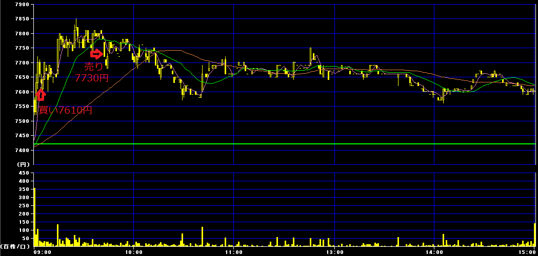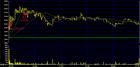 前場9時4分に7610円で100株買いインし、9時42分に7730円で利確。